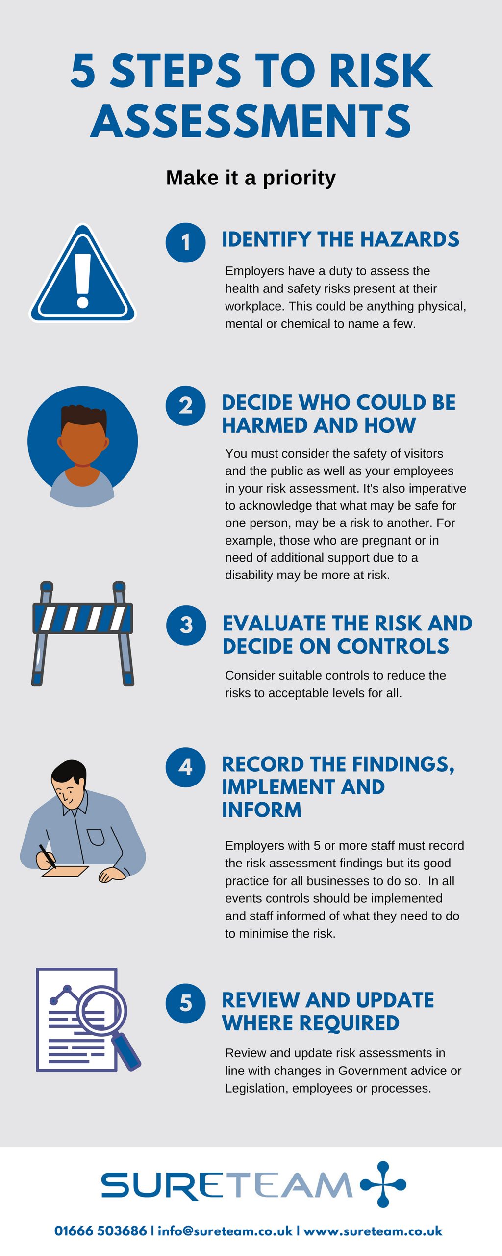 If you have a little panic at the thought of completing a risk assessment or you’re not clear on exactly what to do, we’ve created this infographic to explain the 5 clear steps involved in completing a risk assessment.